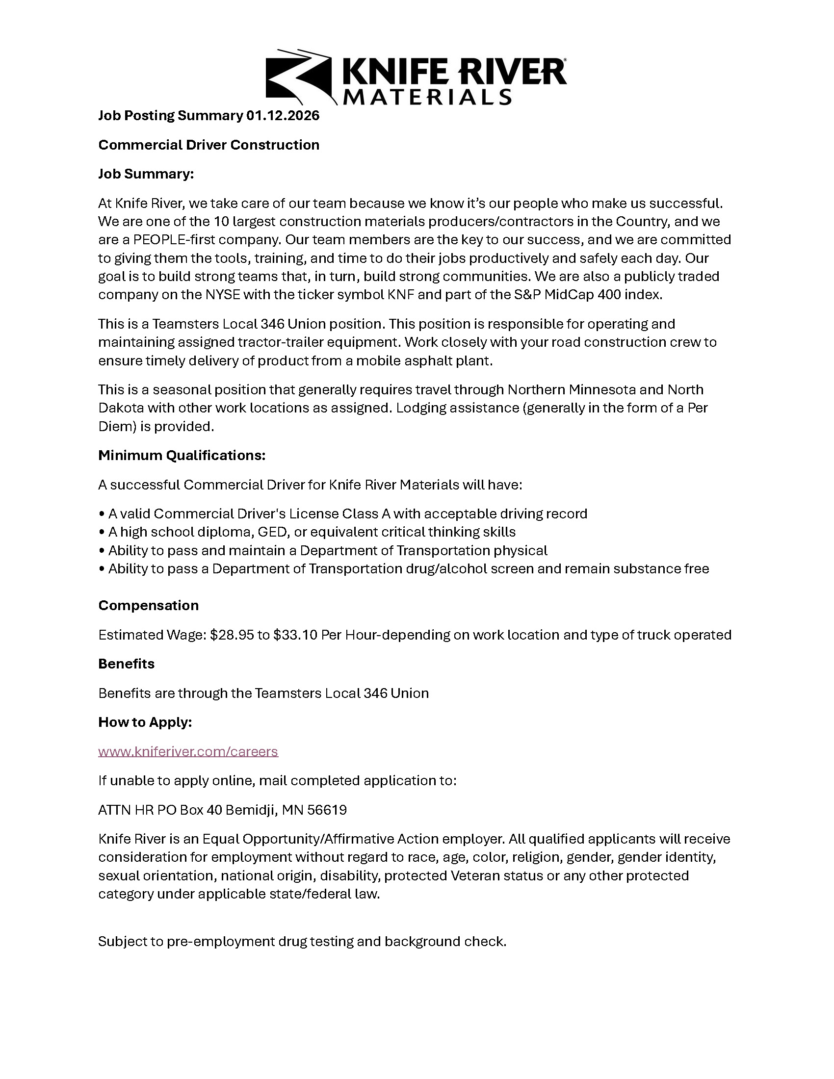 Job Postings *** Please check back, page will be updated as we are informed of openings*** Updated - January 13, 2026 IF YOU CALL OR APPLY FOR THESE JOBS, MAKE SURE TO MENTION OR STATE THAT THE UNION HALL REFFERED YOU TO THESE POSITIONS!!! VEIT - Class A Driver for 2026 - Call Chad Ward 218-628-1037 KTM - Class A Driver - Click Here for their website DTA - Duluth Transit Authority - Drivers - Class B with Passenger Endorsement (will train) ICO - Duluth & Virginia MN is currently looking for drivers (9/4/2024) https://intercityoil.com/employment/ KGM Contractors - Positions to fill for 2025 https://kgmcontractors.com/join-our-team/ 1 - Dump Truck Driver 1 - Side Dump Driver 1 - Tack Truck Drivers Seppi Bros. Concrete - Hiring Redi-Mix Drivers for the upcoming season. Sinnott Contracting - Hiring Class A and/or B drivers for the upcoming season. Contact Chad Ward - 218-628-1037